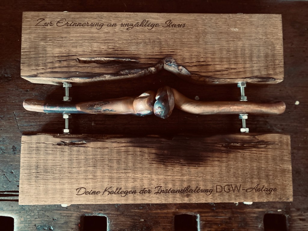 So durfte ich ein Abschiedsgeschenk für einen Mitarbeiter im Ruhestand anfertigen: eine Kombination aus Holz und recyceltem Kupfer, die eine persönliche und einzigartige Erinnerung geschaffen hat.